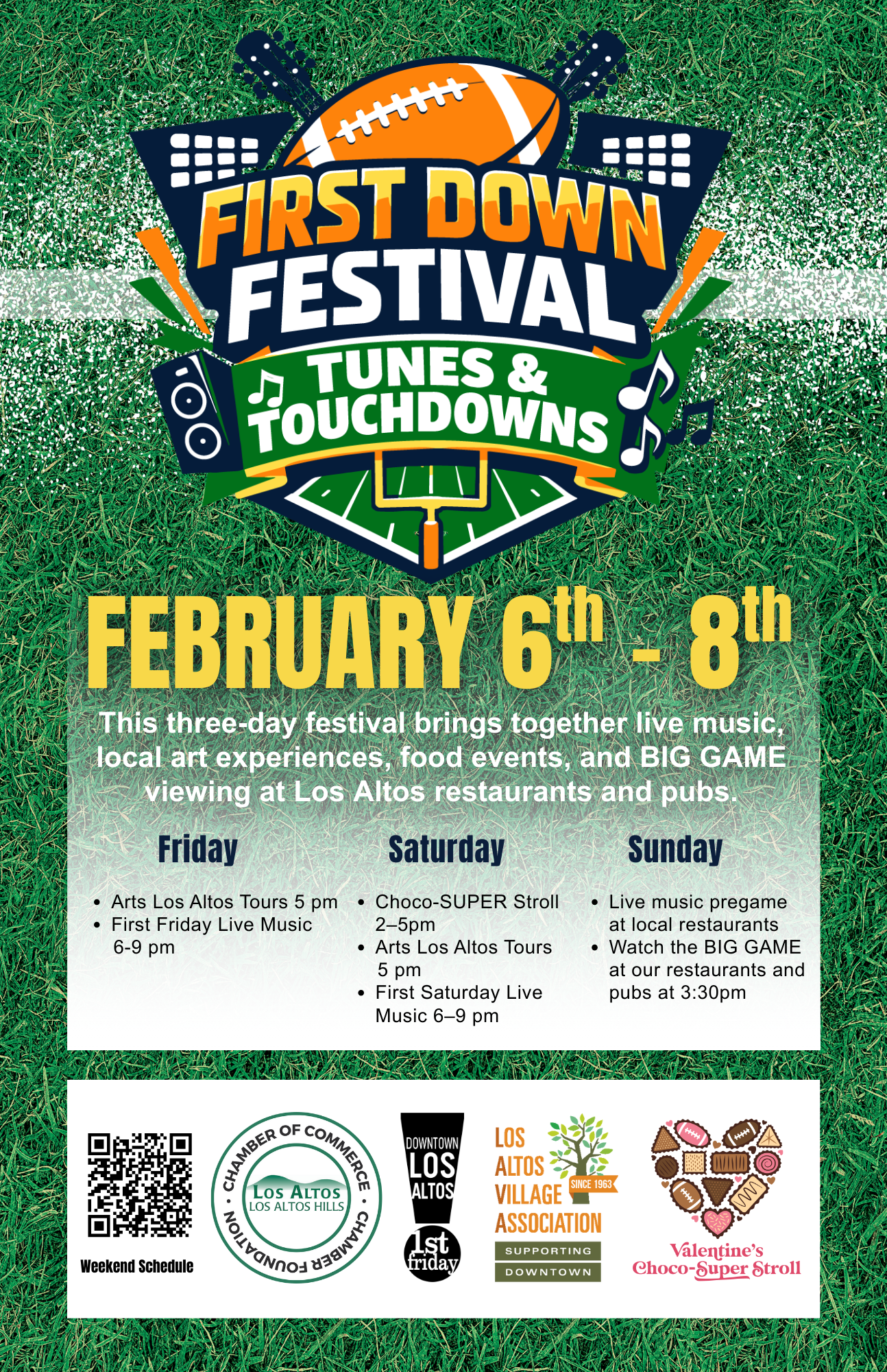 Kick things off on February 6th with First Friday bands jamming from 6-9pm across Downtown Los Altos. Pace yourself, because February 7th brings a sugar blitz at the Downtown Los Altos Valentine’s Choco-SUPER Stroll Experience from 2-5pm, then get ready for an audible as more bands take the stage for a First Saturday substitution that will have music lovers dancing in the end zone and art lovers soaking up the culture. Wrap it all up on Sunday, February 8th, by raising a victory toast at your favorite Downtown Los Altos watering hole.