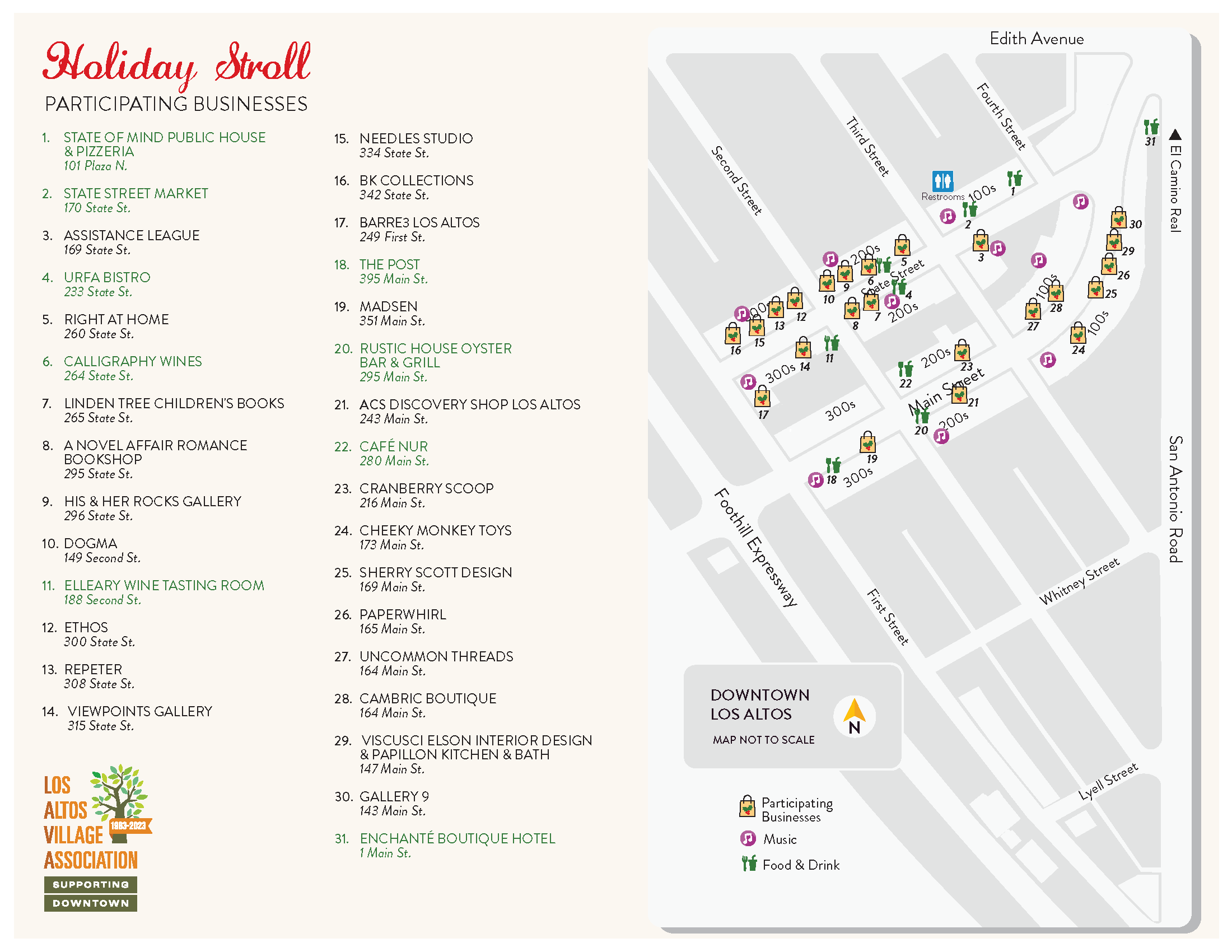 Join the Los Altos Village Association for the 22nd Annual Holiday Stroll through Downtown Los Altos on Friday, November 14th from 5-9pm. Sponsored by Presidential Property Management and Calligraphy Wine.
